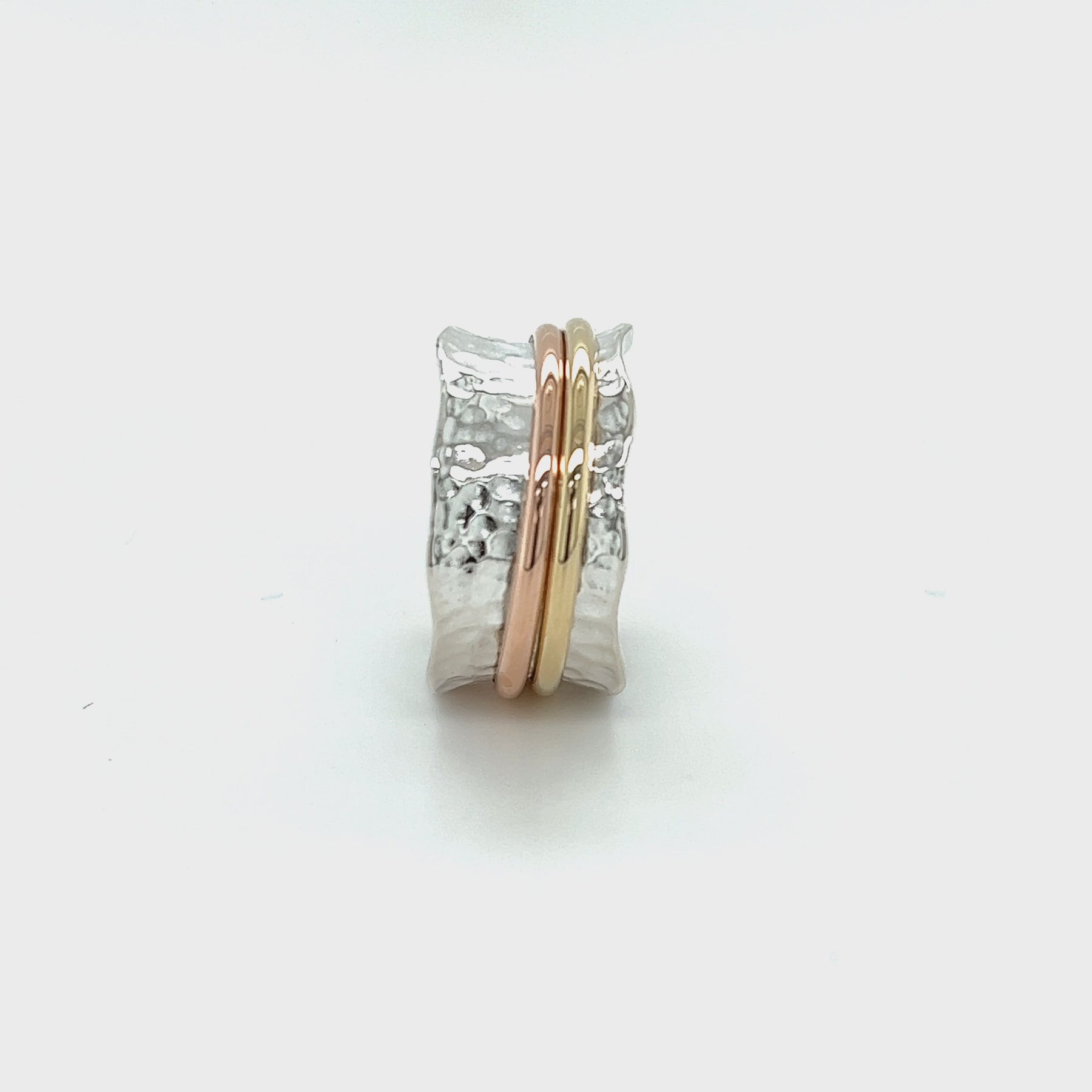 - Materials: .925 Sterling Silver & one 9 KT solid Rose Gold Spinning Band & one 9 KT solid Yellow Gold Spinning Band