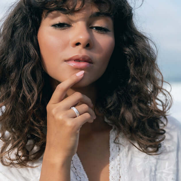 Sterling Silver Stackable Meditation Ring with bubble design edges featuring a Sterling Silver twist design spinning band. Stack them any way you like, these versatile fun Meditation Rings can be worn in many different ways! Includes complimentary MeditationRings Tin & Travel Pouch