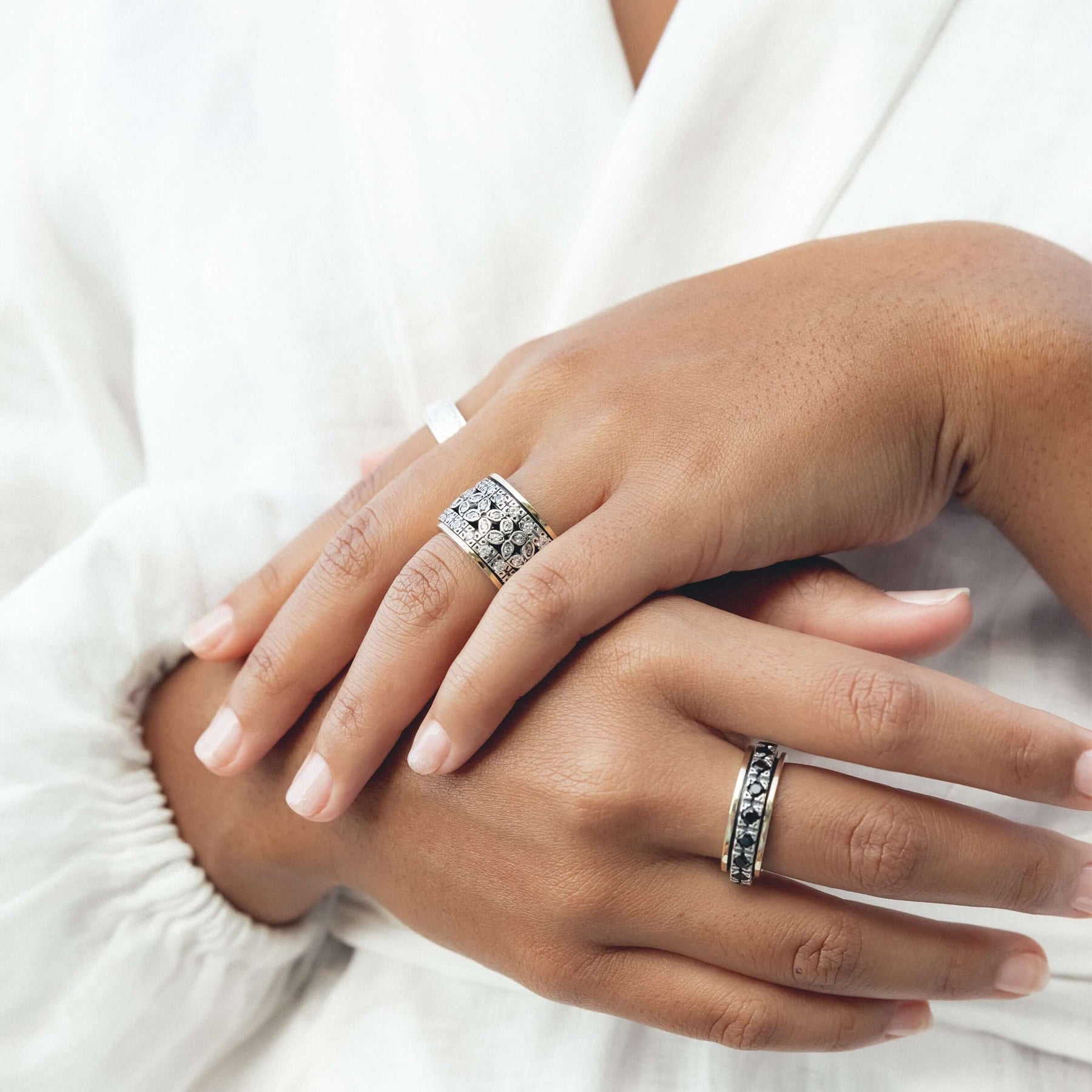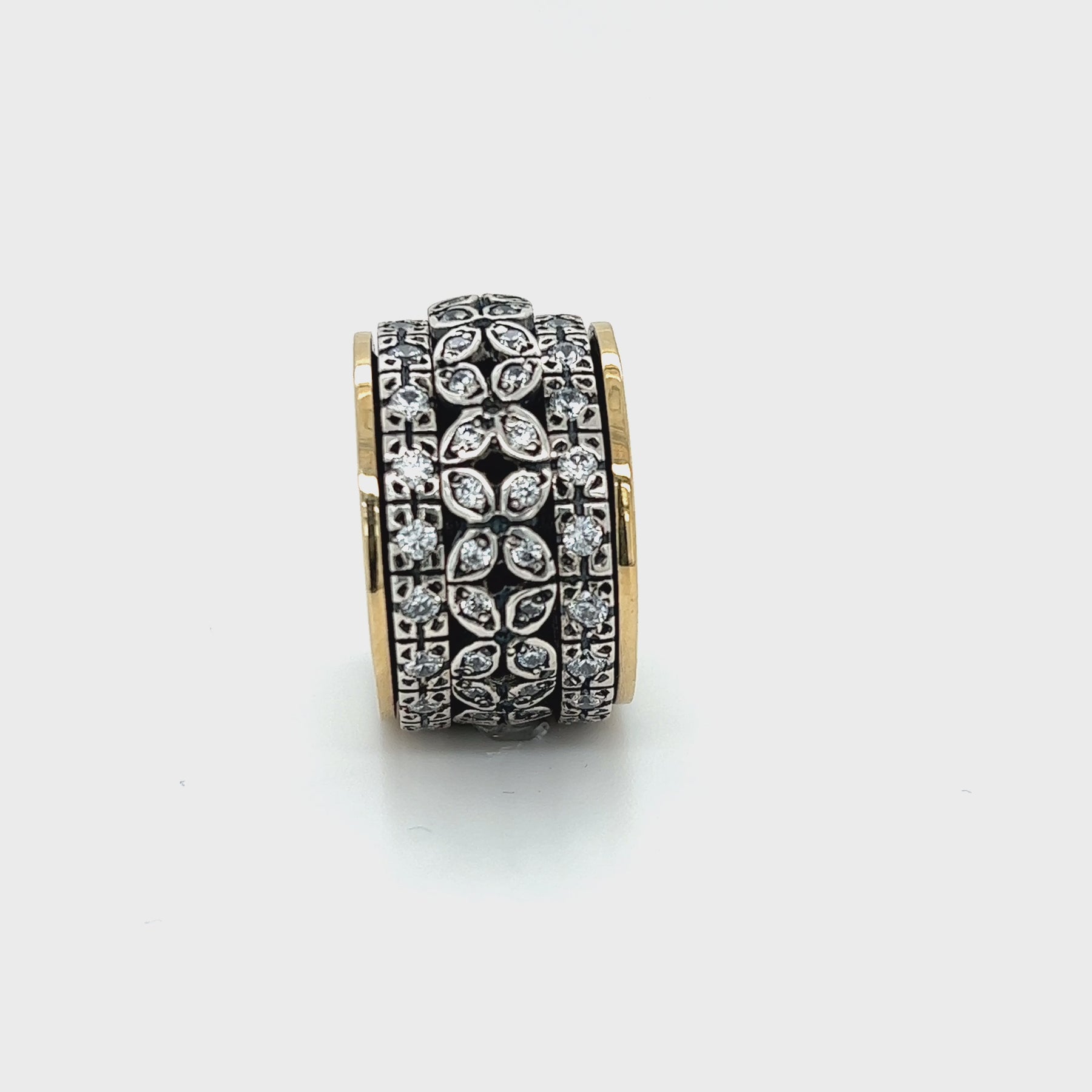 Striking Sterling Silver Meditation Ring with three CZ large spinning bands, the center band is designed as an intricate and beautiful flower pattern with Yellow Gold edges. Includes complimentary MeditationRings Tin & Travel Pouch