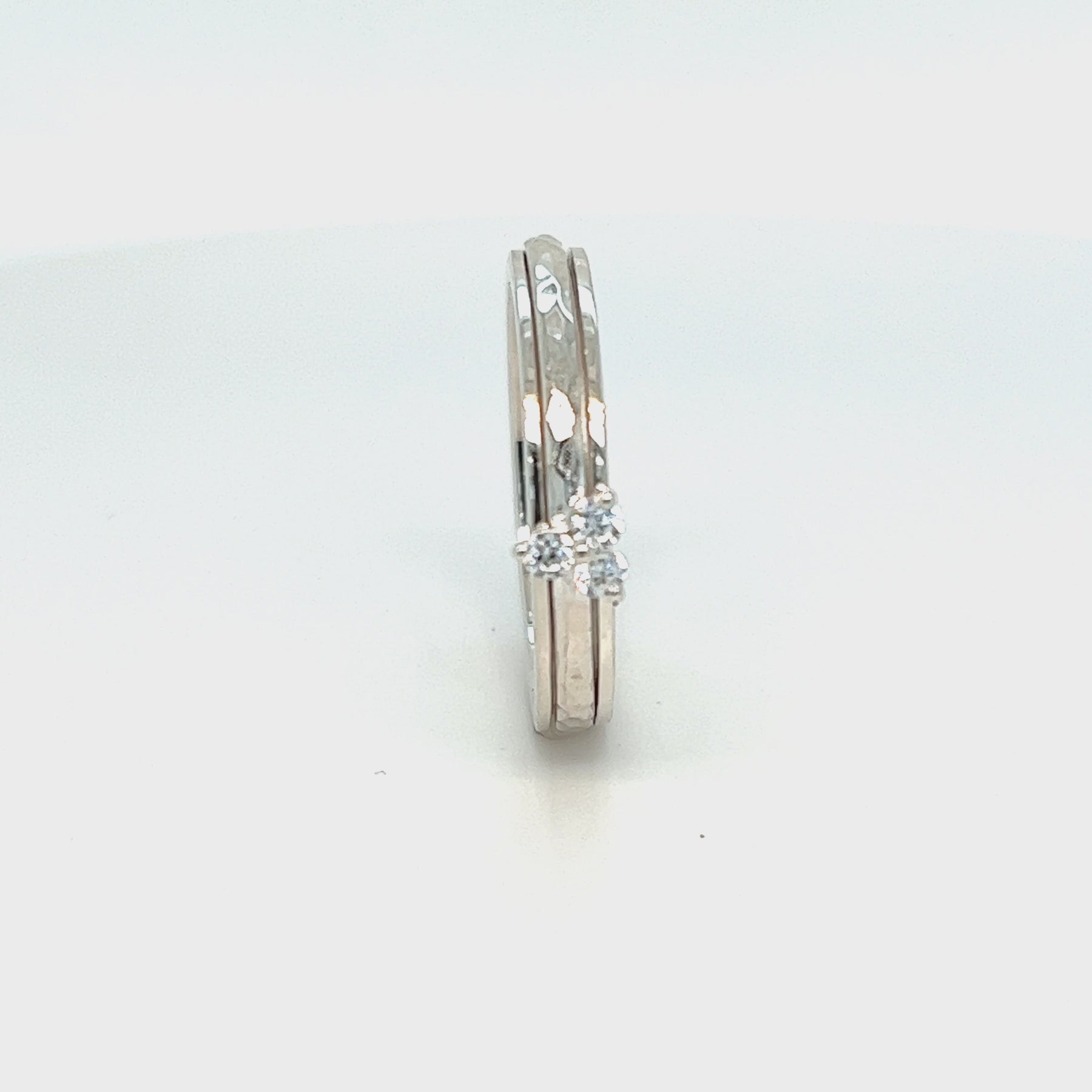 Sterling Silver Meditation Ring with gently hammered center spinning band featuring a clear CZ Three Tear Drop element. Stack them any way you like, these versatile fun Meditation Rings can be worn in many different ways! Includes complimentary MeditationRings Tin & Travel Pouch.