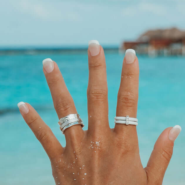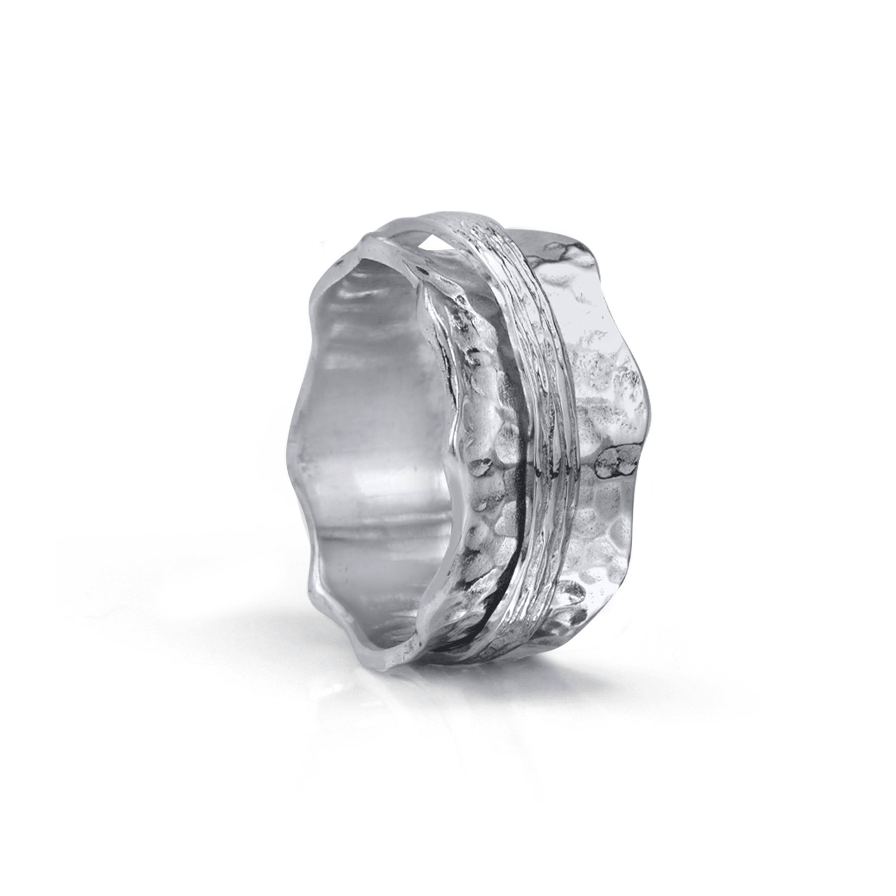 Sterling Silver Meditation Ring with scalloped edges and one spinning bands. Includes complimentary MeditationRings Tin & Travel Pouch