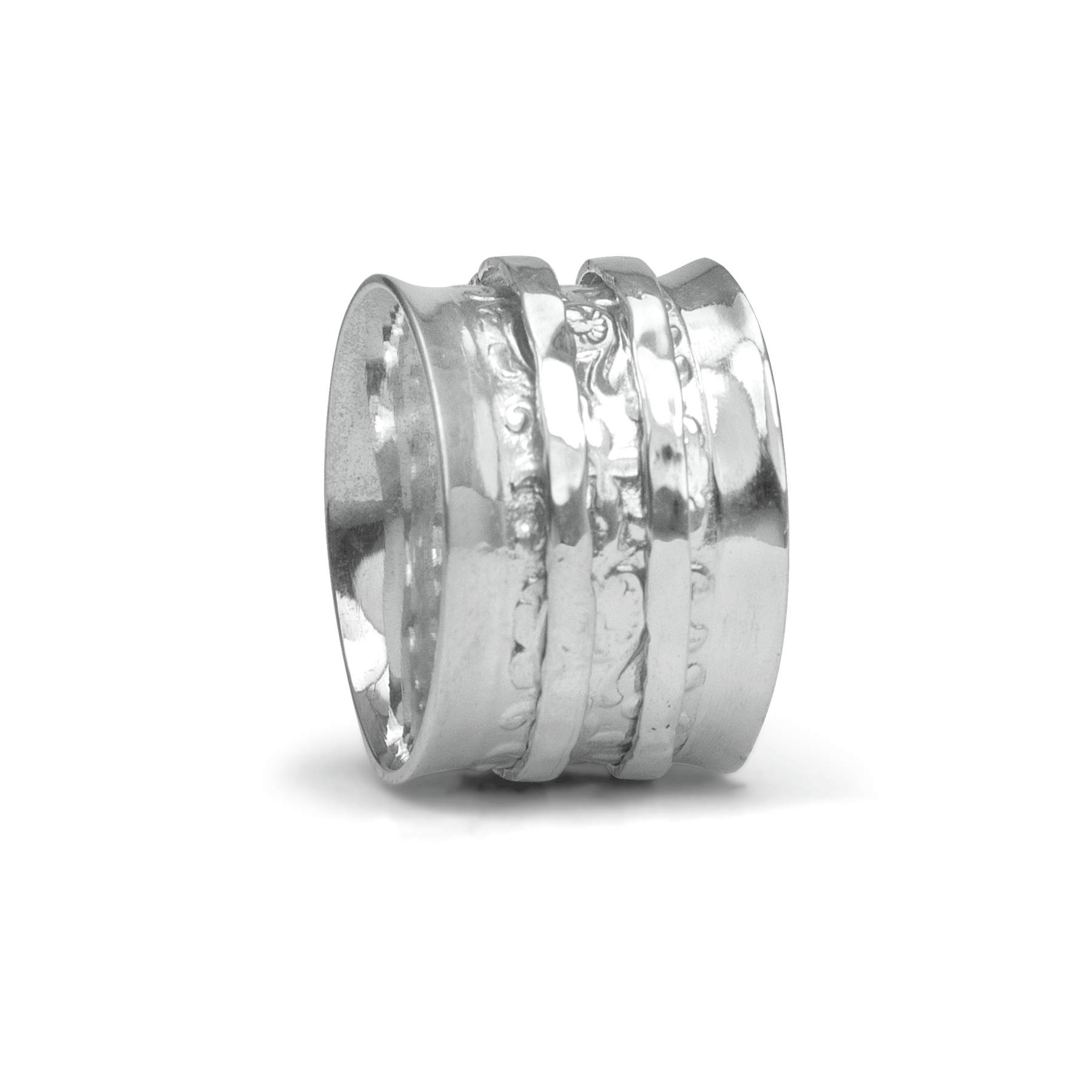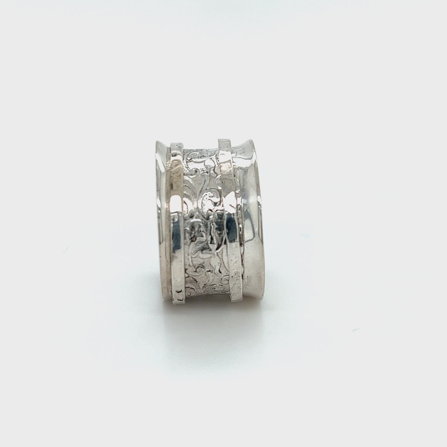 Sterling Silver Meditation Ring with polished edges and two spinning bands, and a beautiful filigree pattern on the base. Includes Complimentary MeditationRings Tin & Travel Pouch