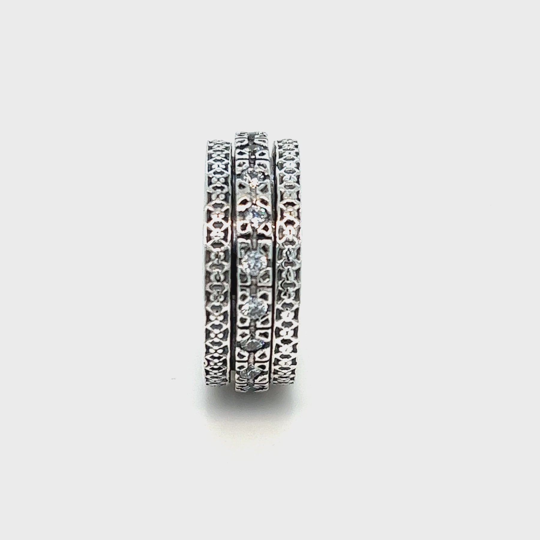 Sterling Silver Meditation Ring featuring CZ center spinning band and intricate detailing on the edges of the band. Includes complimentary MeditationRings Tin & Travel Pouch