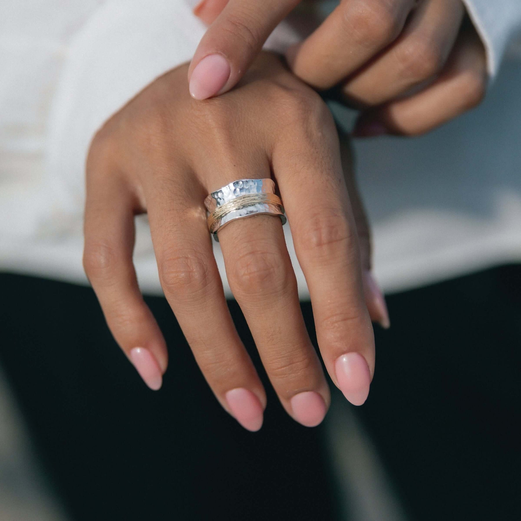 Elegant Sterling Silver Meditation Ring with one thick Yellow Gold spinning band and scalloped edges. Includes complimentary MeditationRings Tin & Travel Pouch