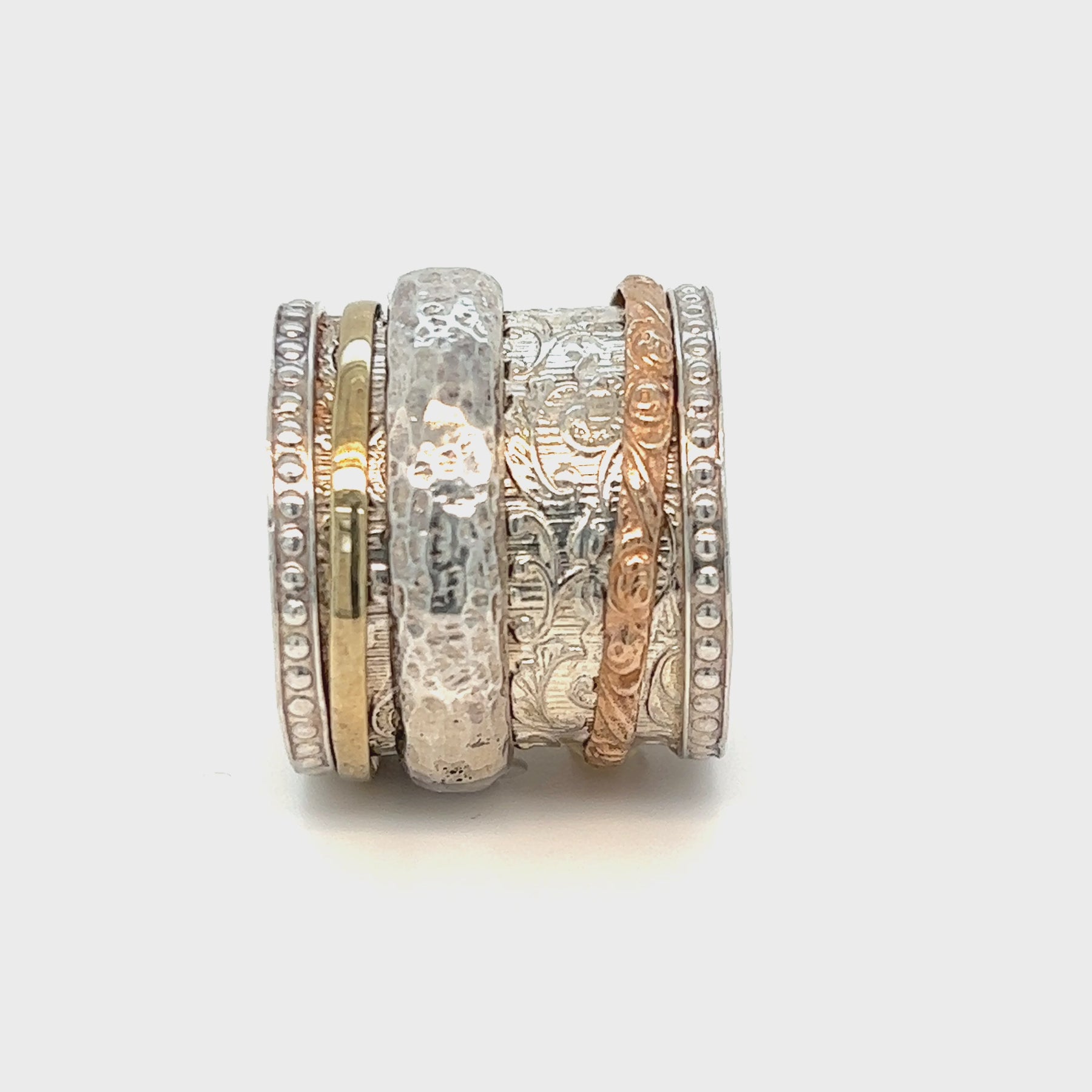 Breathtaking Sterling Silver Filigree Meditation Ring with one thick hammered Silver spinning band and one pretty flower pattern Rose Gold Band and one Yellow Gold spinning band. Includes complimentary MeditationRings Tin & Travel Pouch