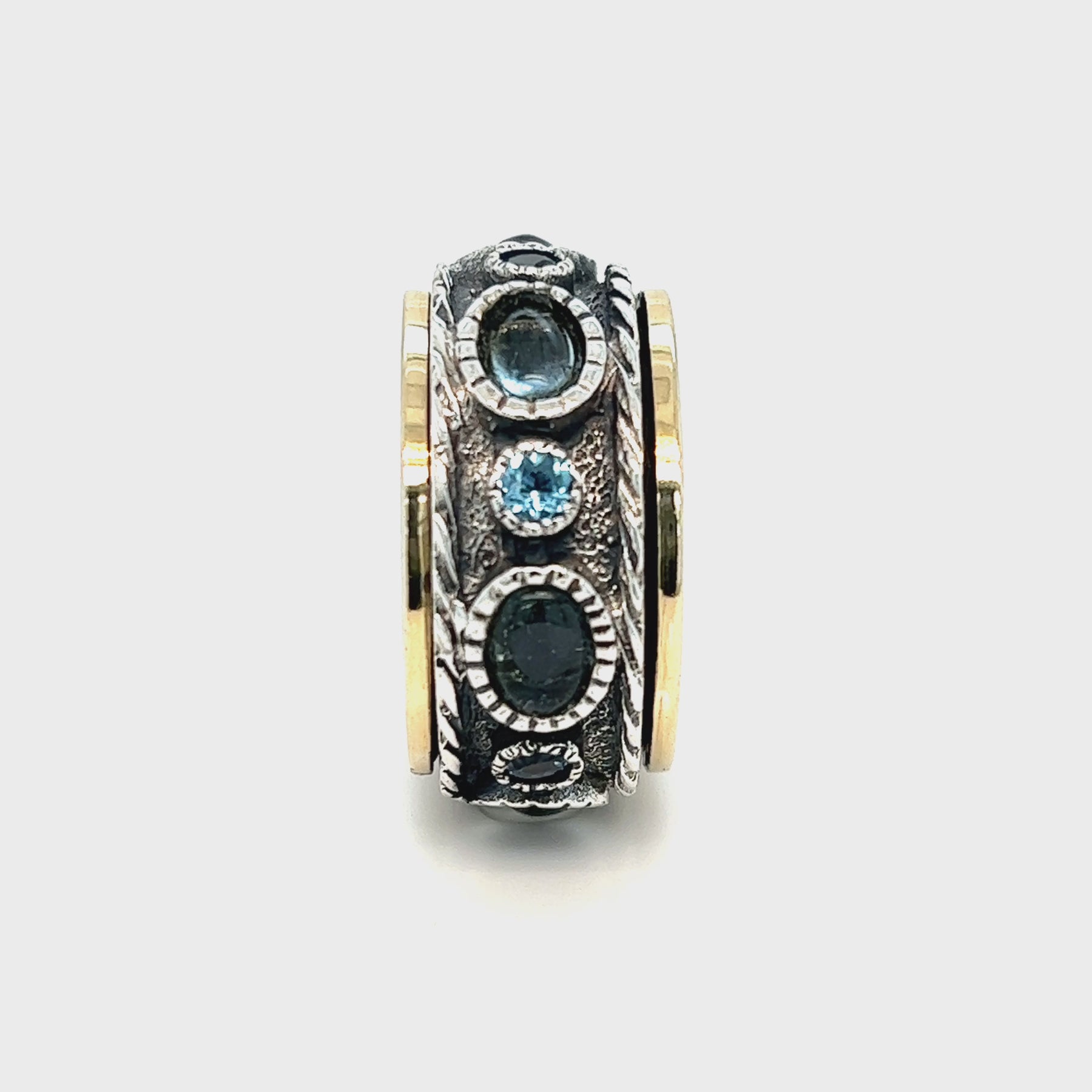 Unique Sterling Silver Meditation Ring featuring Semi-Precious Blue Topaz Gemstones and oxidized spinning band with two Yellow Gold edges. Includes complimentary MeditationRings Tin & Travel Pouch
