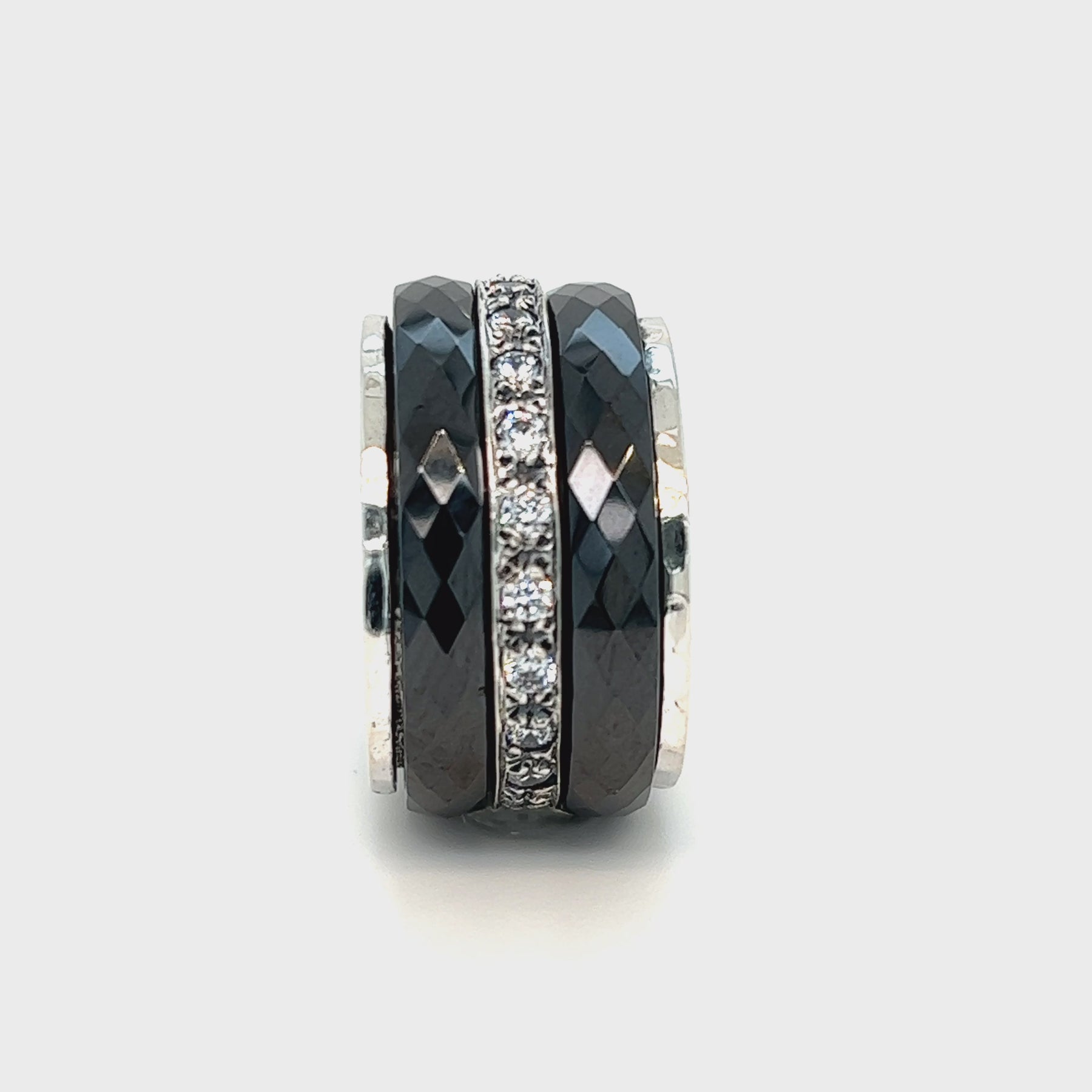 Stunning Sterling Silver Meditation Ring with two beautiful Black Ceramic spinning bands, and a beautiful CZ center spinning band. Includes complimentary MeditationRings Tin & Travel Pouch
