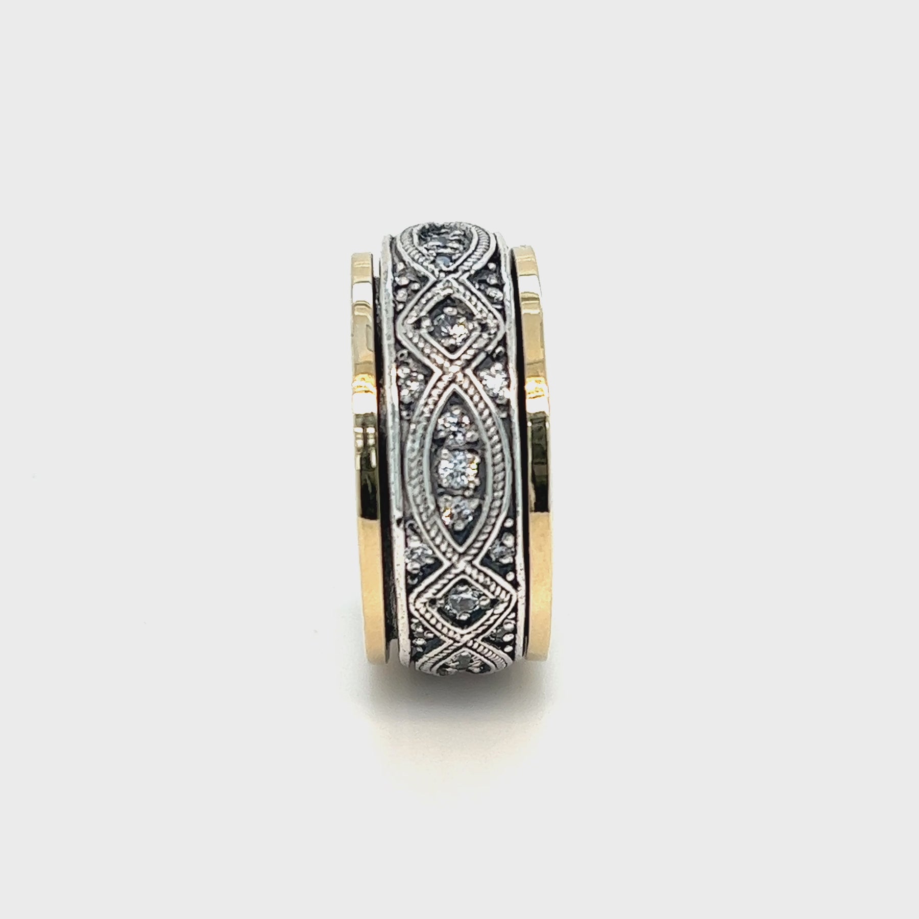 Sterling Silver Meditation Ring featuring Yellow Gold edges and an intricate oval and diamond design spinning band with CZ stones. Includes complimentary MeditationRings Tin & Travel Pouch